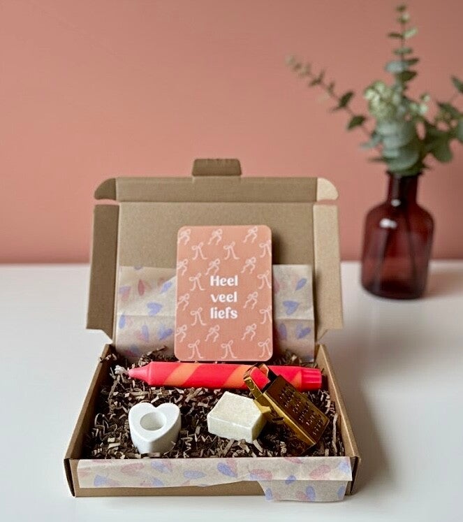 Alles wordt met veel liefde ingepakt in met zijdevloeipapier, een droogbloem en schrijven het kaartje met jouw persoonlijke tekst.