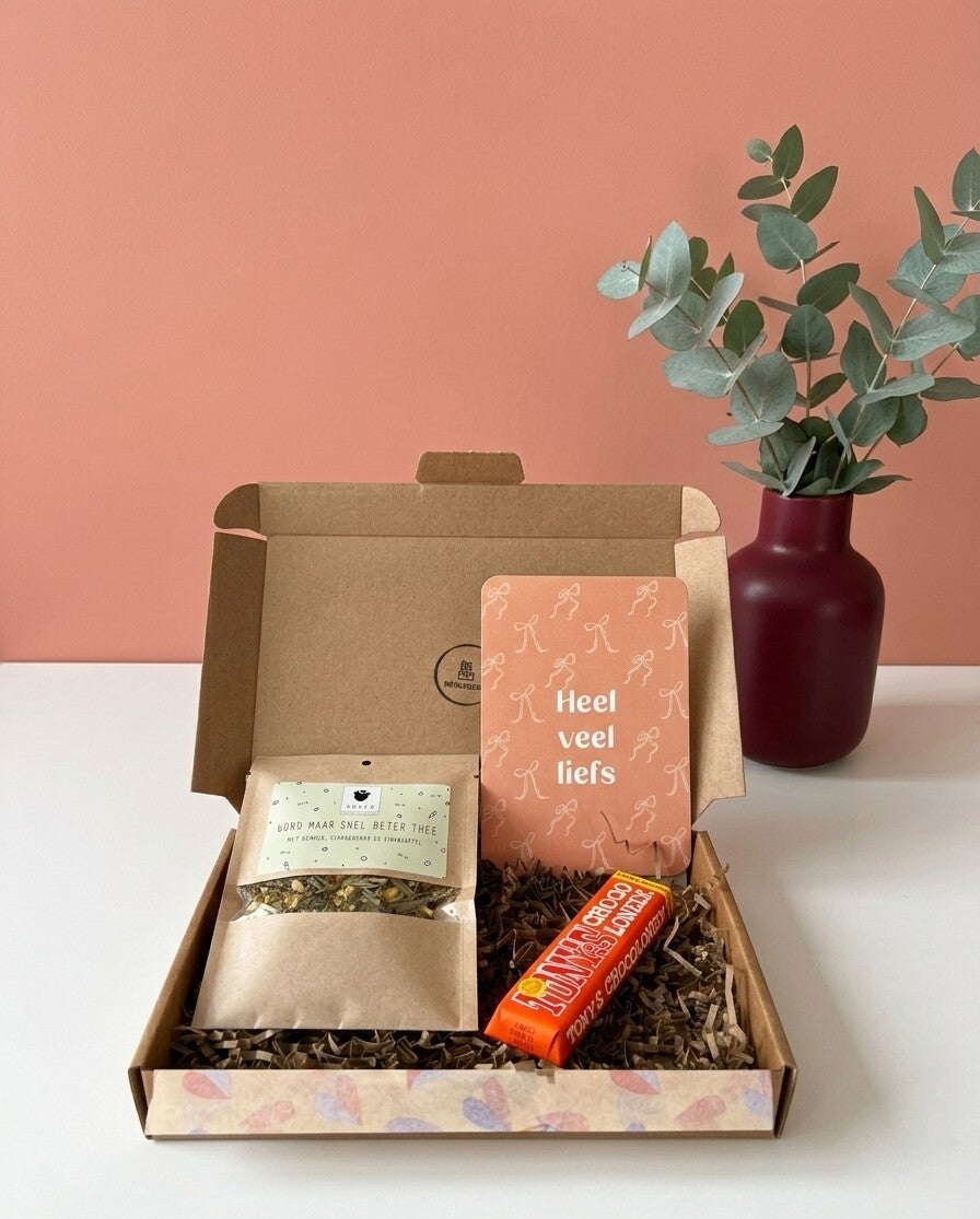 De beterschap thee zorgt voor een warm moment op de bank, de Tony Chocolonely mini reep karamel zeezout is dé perfecte traktatie en de bijgevoegde wenskaart maakt het helemaal persoonlijk. Drie simpele dingen die samen precies het juiste zeggen: wordt maar snel beter.
